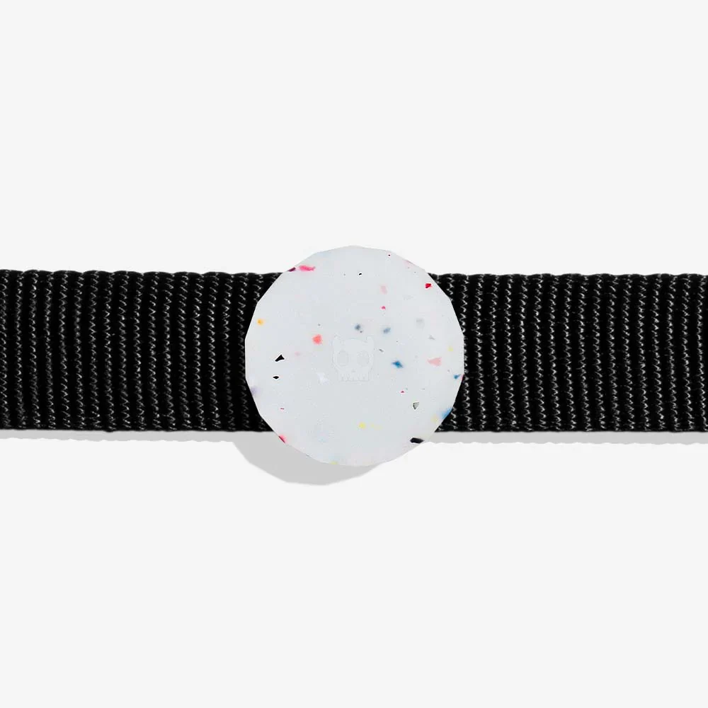 Fabricado con 100% silicona flexible y resistente, este soporte se desliza fácilmente sobre collares y correas de arnés de hasta 2.5 cm de ancho, asegurando un ajuste firme sin incomodar a tu perro. Su diseño único en color blanco con detalles multicolor lo hace llamativo y moderno, combinando estilo y funcionalidad.